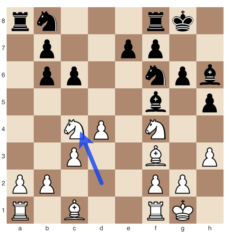 An Brett 5 hatte Tim ein kompliziertes Mittelspiel. In folgender Stellung lockte Tim seinen Gegner erfolgreich in die Variante 14… Lxf4 Lxf4 Ld3, welche auf den ersten Blick nach Materialgewinn für Schwarz aussieht.