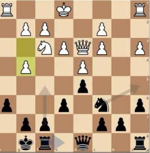 Nach Zug 13 erreichte Camilo eine ausgeglichene Stellung. Der Angriff von Weiß war noch nicht stark genug, obwohl es ein genaues Spiel von Schwarz benötigte, um standzuhalten. Doch dann übersah Camilo eine der drei möglichen Fortsetzungen, geriet durch einen leichten Fehler in eine Verluststellung und verlor leider sein zweites Spiel für den SK Union Oldenburg.